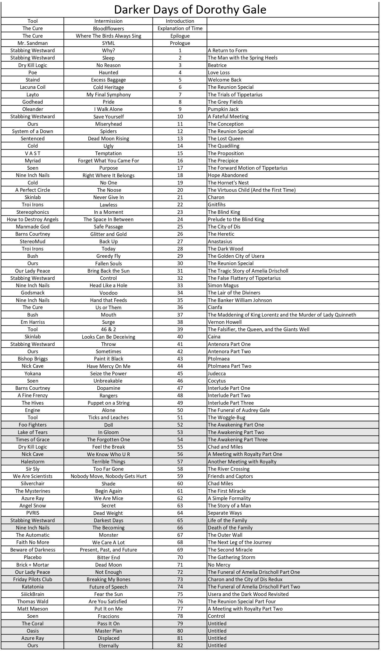 Find the unofficial soundtracks of Dark Days and Dark[er] Days of Dorothy Gale on Spotify.